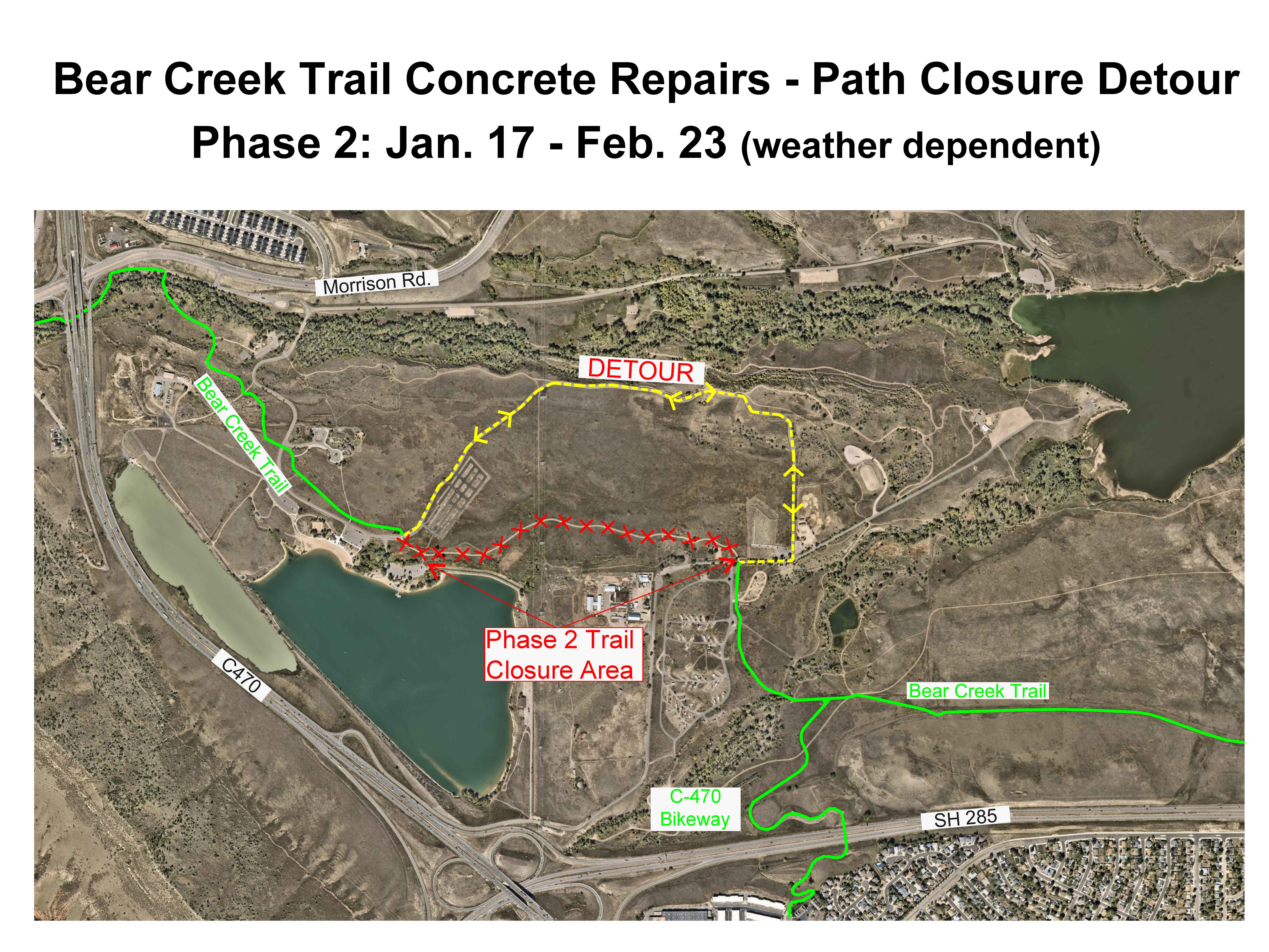 Portions of the popular Bear Creek Trail in Bear Creek Lake Park will be improved in 2026! Construction including concrete repairs for phase two of this project are set to occur from Jan. 17 to Feb. 23, weather dependent. Detours are in place, for your safety, follow posted signage. Thank you to our partners at Jefferson County Parks and Open Space for supporting this project through the JCPOS Trails Partnership Program.